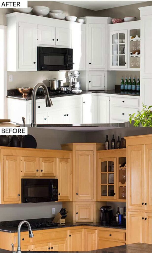 การปรับโฉมห้องครัวด้วยการทาสีขาว Cloud Cover OC-25 ลงบนชุดไม้เก่า ทำให้ห้องครัวดูโปร่งและทันสมัยขึ้นอย่างเห็นได้ชัด